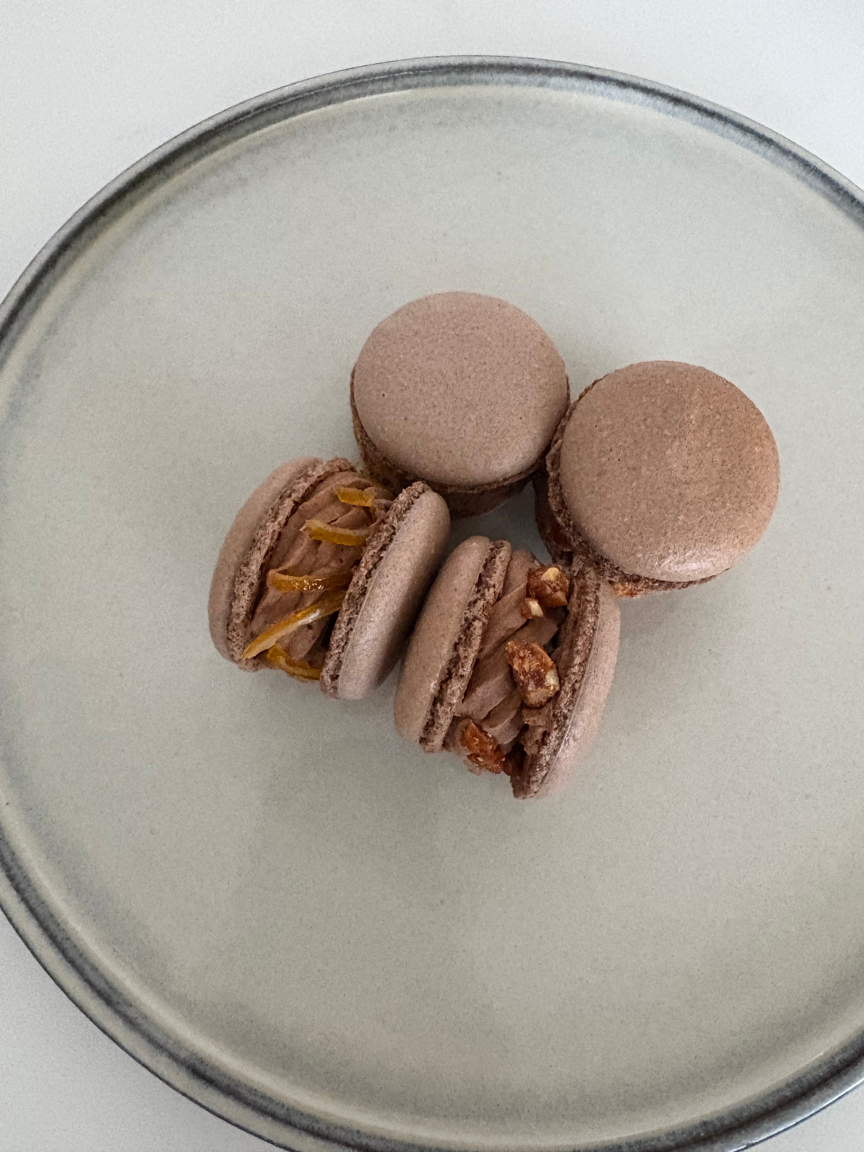 ショコラ風味のマカロン生地にチョコレートを贅沢に使用したバタークリームを合わせました。