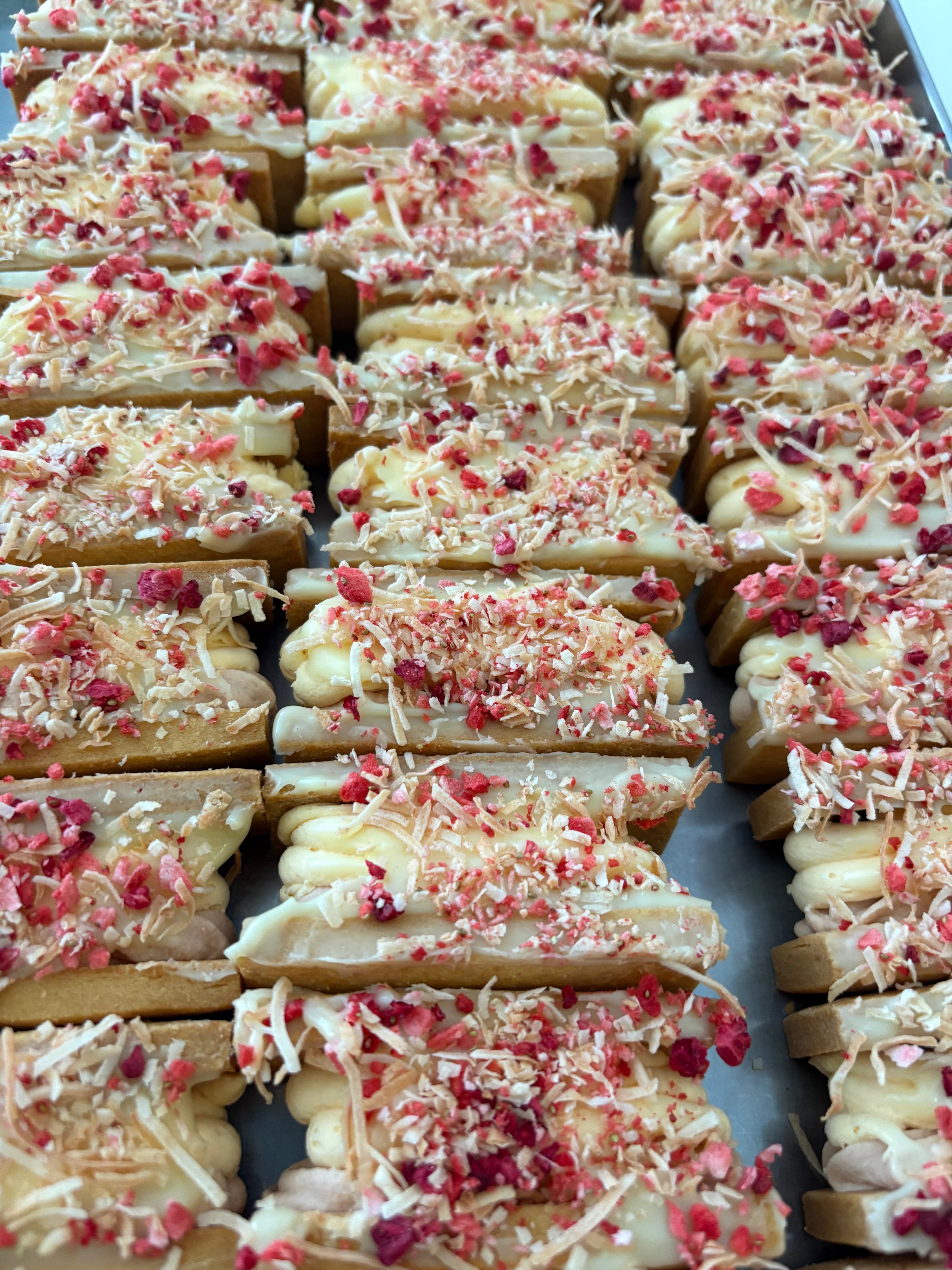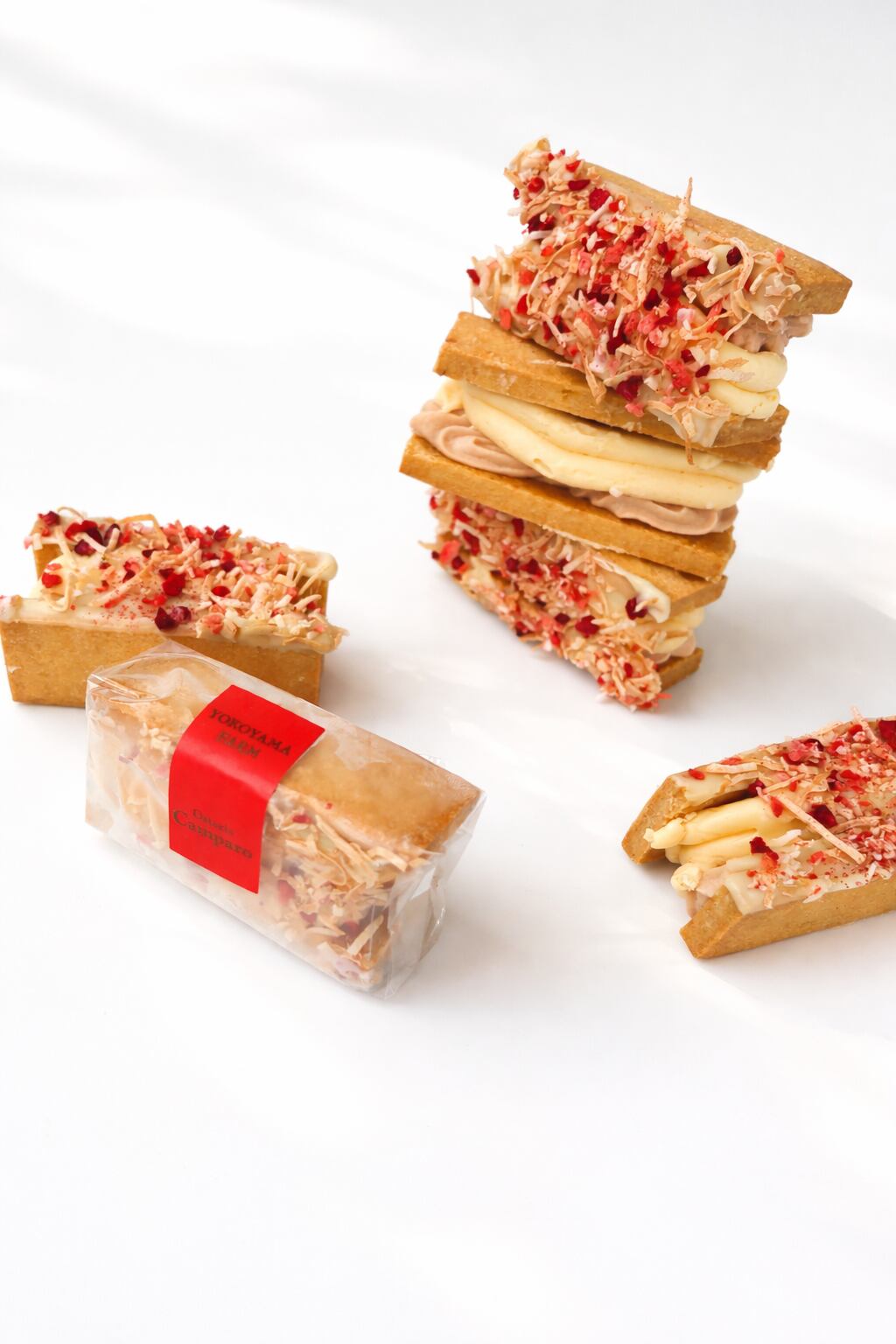 ココナッツやドライの苺を散りばめた目にも楽しい春のバターサンドです。